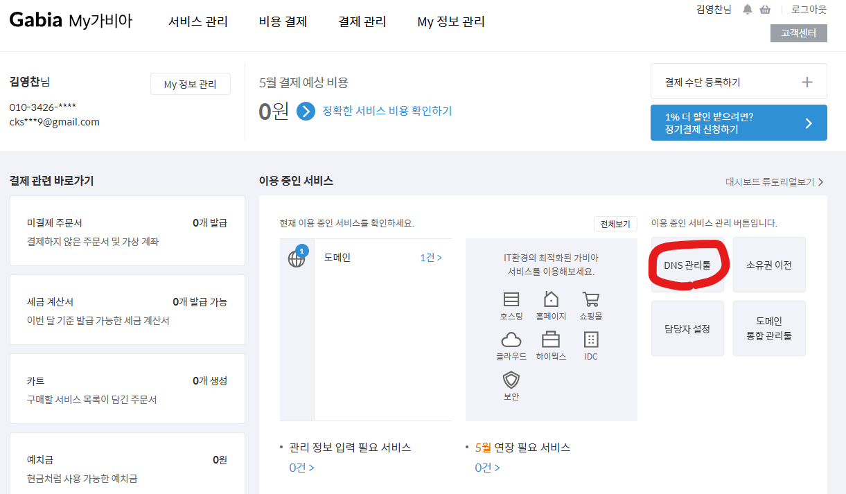 1. 가비아 로그인 후 MY가비아 → DNS 관리툴로 이동합니다.
