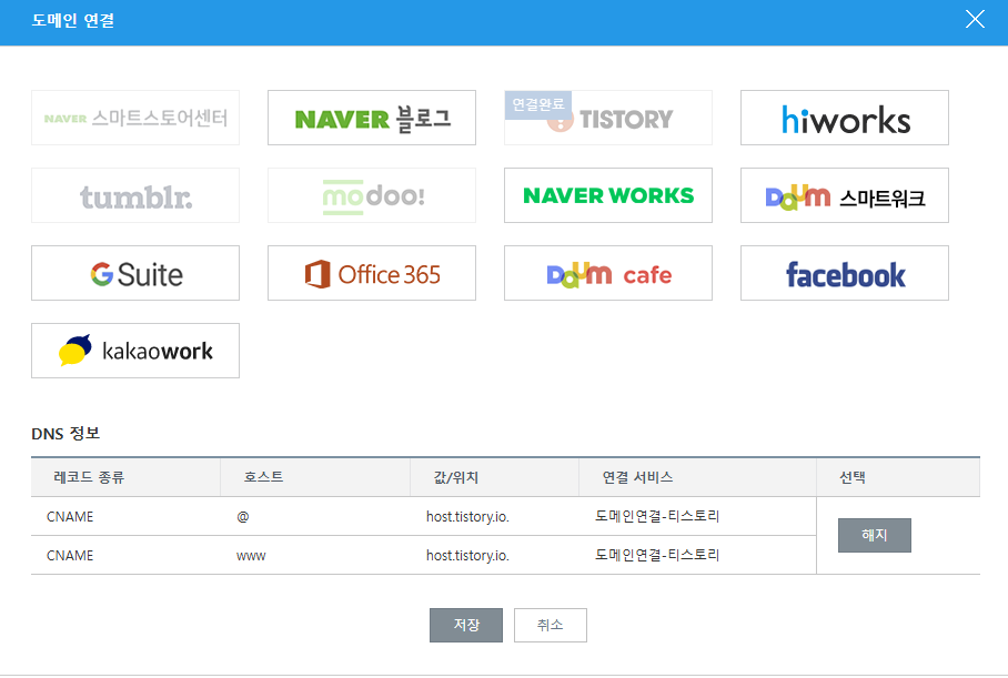 2. 도메인 연결을 티스토리로 클릭하면 됩니다. 저장만 누르면 끝